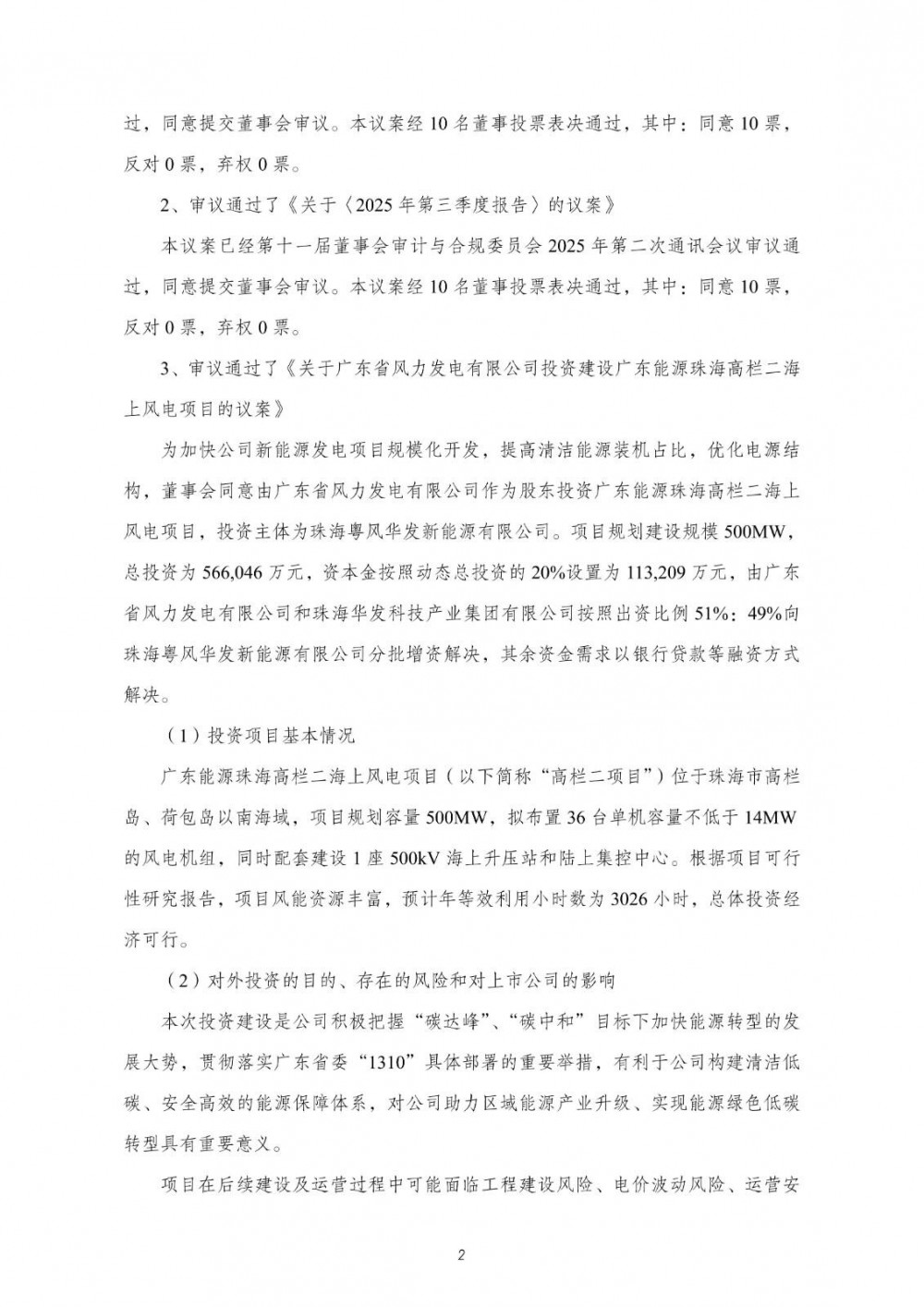 公告显示,粤电力于2025年10月29日召开第十一届董事会第八次会议,审议通过了《关于广东省风力发电有限公司投资建设广东能源珠海高栏二海上风电项目的议案》,为加快公司新能源发电项目规模化开发,提高清洁能源装机占比,优化电源结构,董事会同意由广东省风力发电有限公司作为股东投资广东能源珠海高栏二海上风电项目,投资主体为珠海粤风华发新能源有限公司。