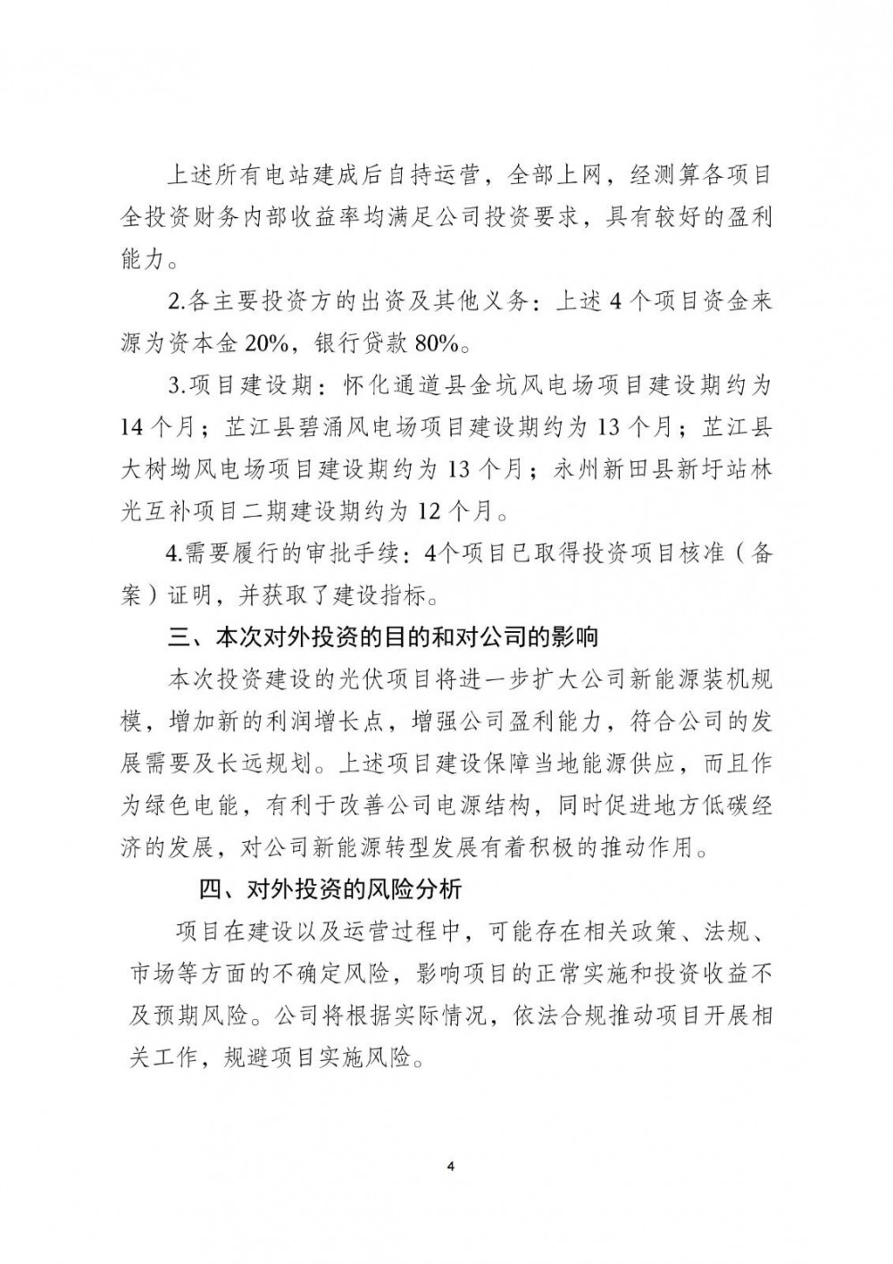 项目建设期:怀化通道县金坑风电场项目建设期约为14个月;芷江县碧涌风电场项目建设期约为13个月;芷江县大树坳风电场项目建设期约为13个月;永州新田县新圩站林光互补项目二期建设期约为12个月。