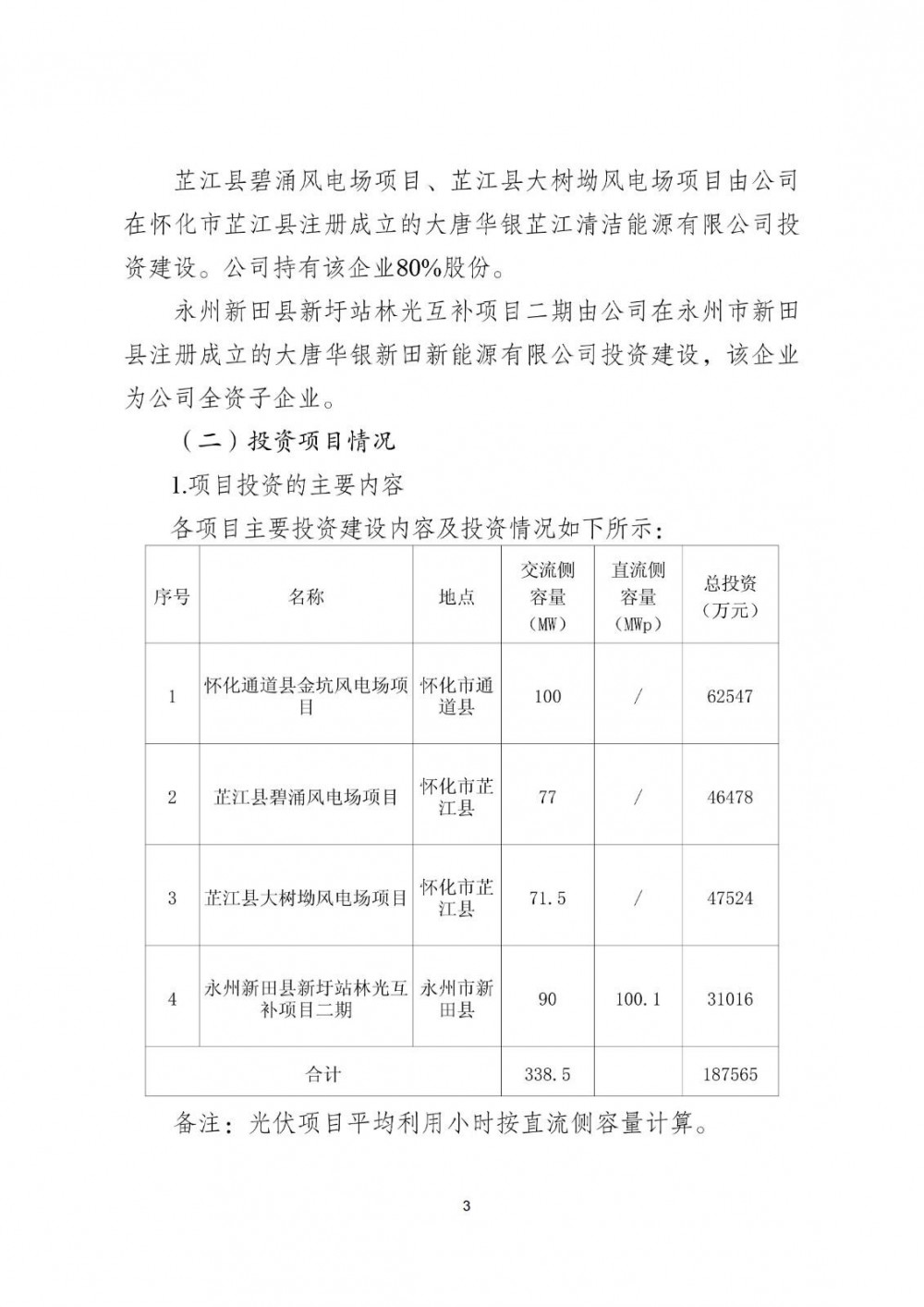 公告显示,华银电力拟投资建设怀化通道县金坑风电场项目、芷江县碧涌风电场项目、芷江县大树坳风电场项目、永州新田县新圩站林光互补项目二期,上述4个项目装机容量共计338.5兆瓦,项目总投资额约为187,565 万元。