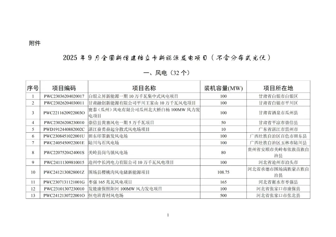 2025年9月,全国新增建档立卡新能源发电(不含户用光伏)项目共7218个,其中风电项目32个,光伏发电项目7184个(集中式光伏发电项目34个,工商业分布式光伏发电项目7150个),生物质发电项目2个。风电、集中式光伏发电、生物质发电项目清单见附件,工商业分布式光伏发电项目清单详见国家可再生能源发电项目信息管理平台网站(网址https://jdlk.renewable.org.cn/card-info-sheet/)。