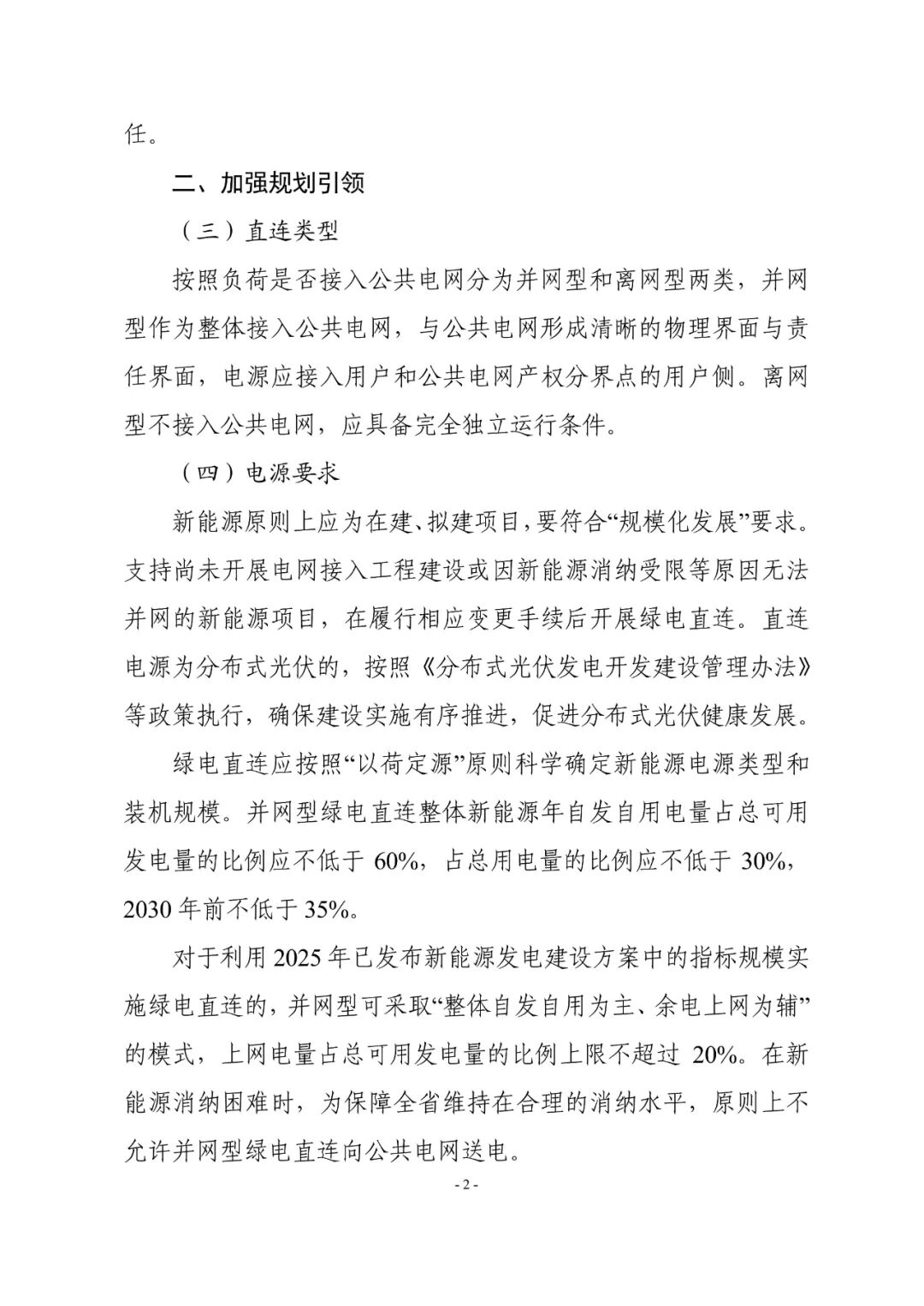 对于利用2025年已发布新能源发电建设方案中的指标规模实施绿电直连的,并网型可采取“整体自发自用为主、余电上网为辅”的模式,上网电量占总可用发电量的比例上限不超过20%。在新能源消纳困难时,为保障全省维持在合理的消纳水平,原则上不允许并网型绿电直连向公共电网送电。
