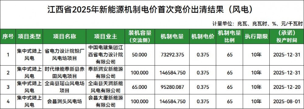 文件明确,经公开竞价和结果公示,2025年江西省新能源机制电价竞价结果为:风电项目机制电量为4.62亿千瓦时,机制电价为0.375元/千瓦时(含税,下同);光伏项目机制电量为1.31亿千瓦时,机制电价为0.330元/千瓦时。