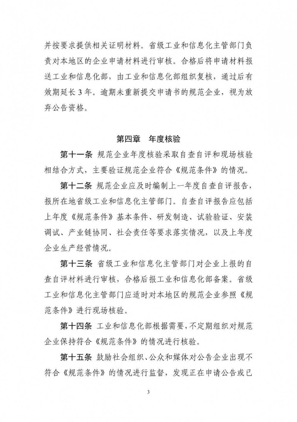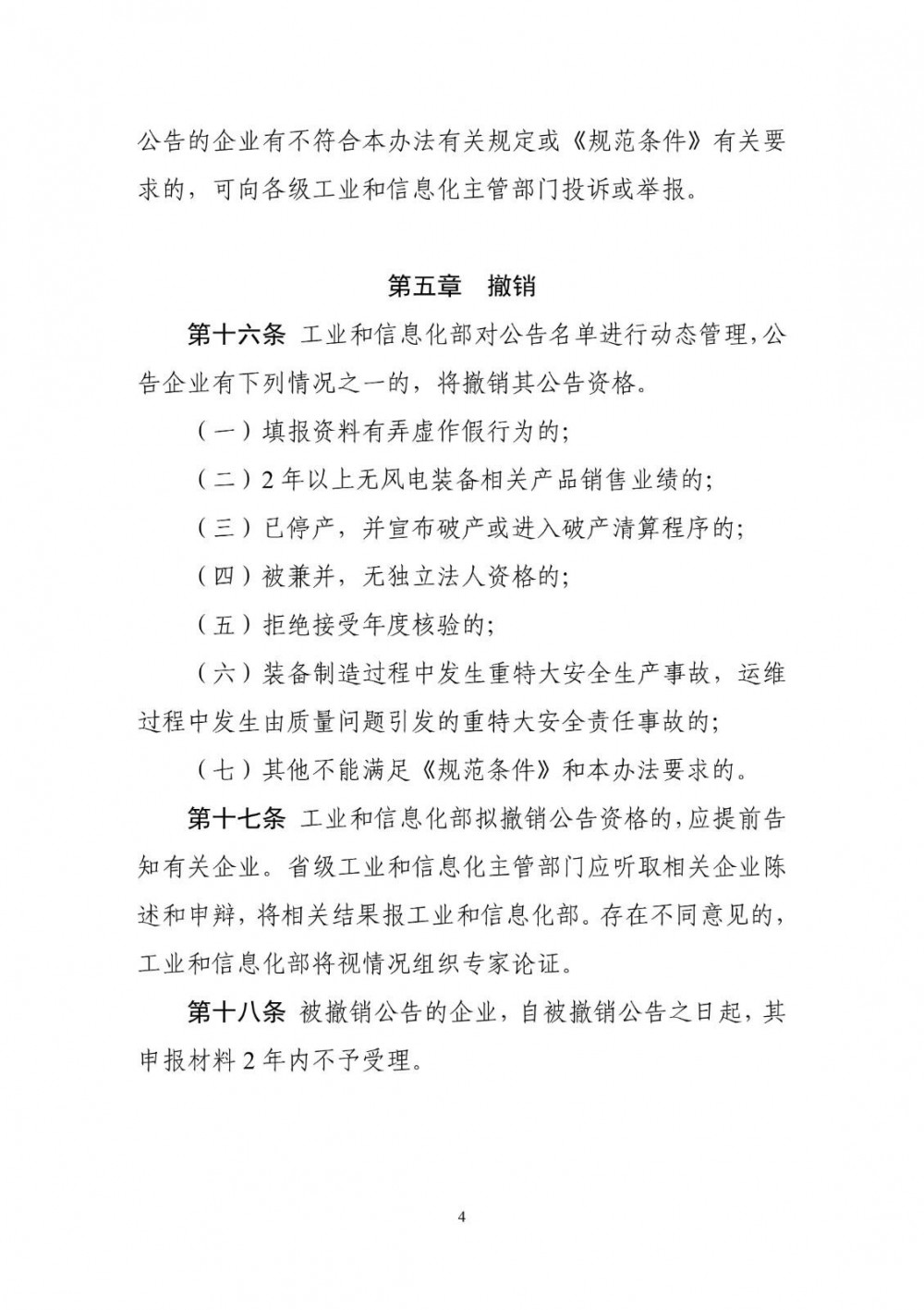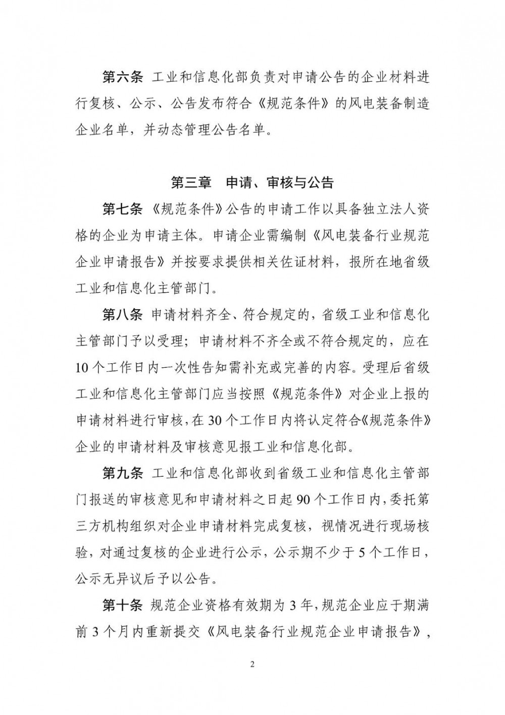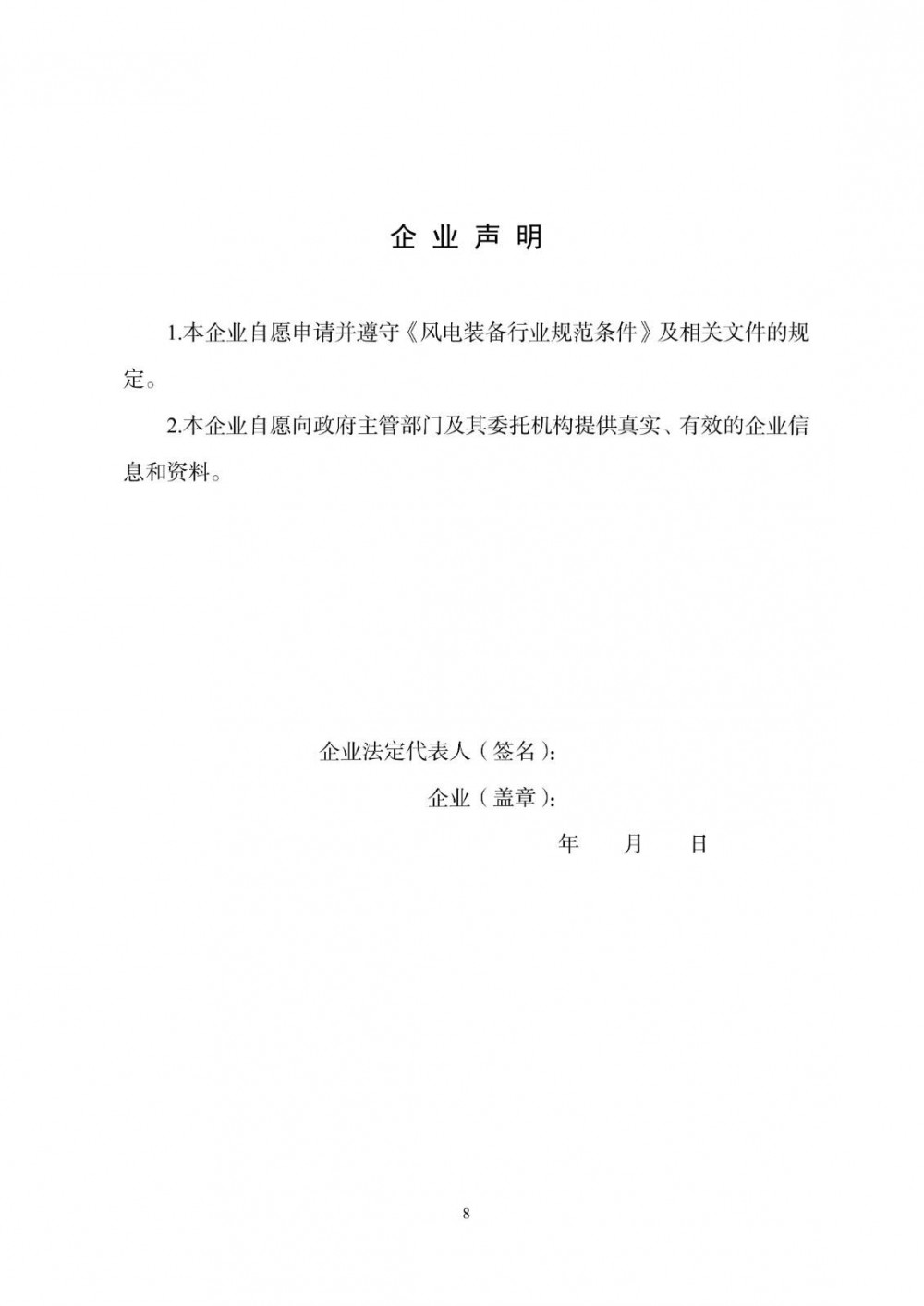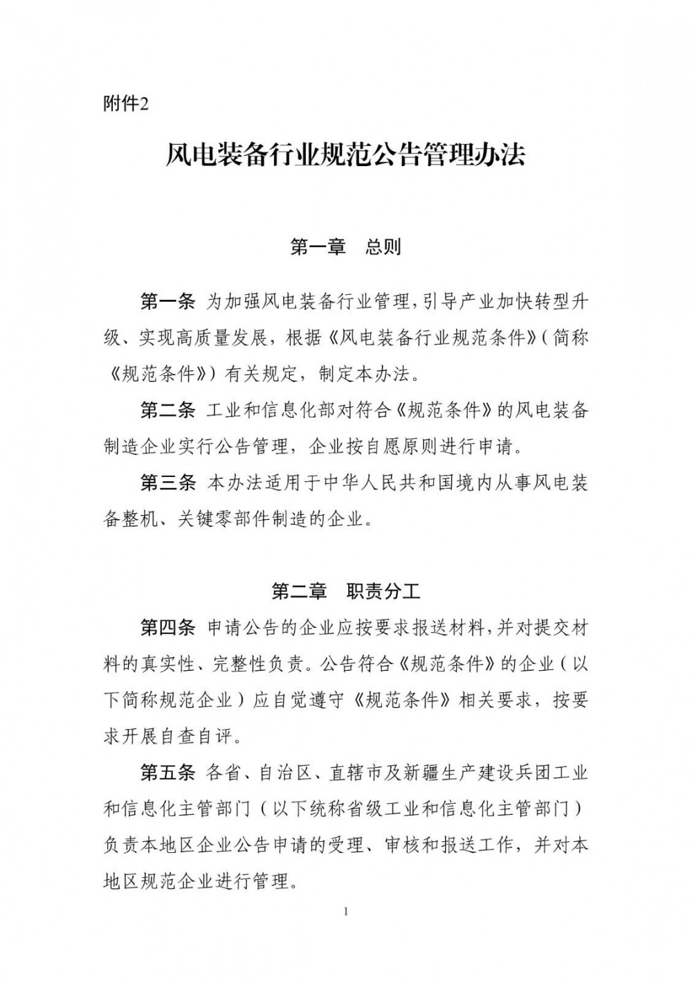 工业和信息化部对符合《规范条件》的风电装备制造企业实行公告管理,企业按自愿原则进行申请。本办法适用于中华人民共和国境内从事风电装备整机、关键零部件制造的企业。