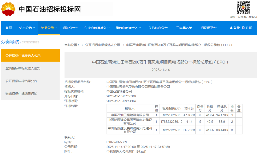 能源圈获悉,11月14日,中国石油青海油田海西200万千瓦风电项目风电场部分一标段总承包(EPC)中标候选人公示,规模为812.5MW。