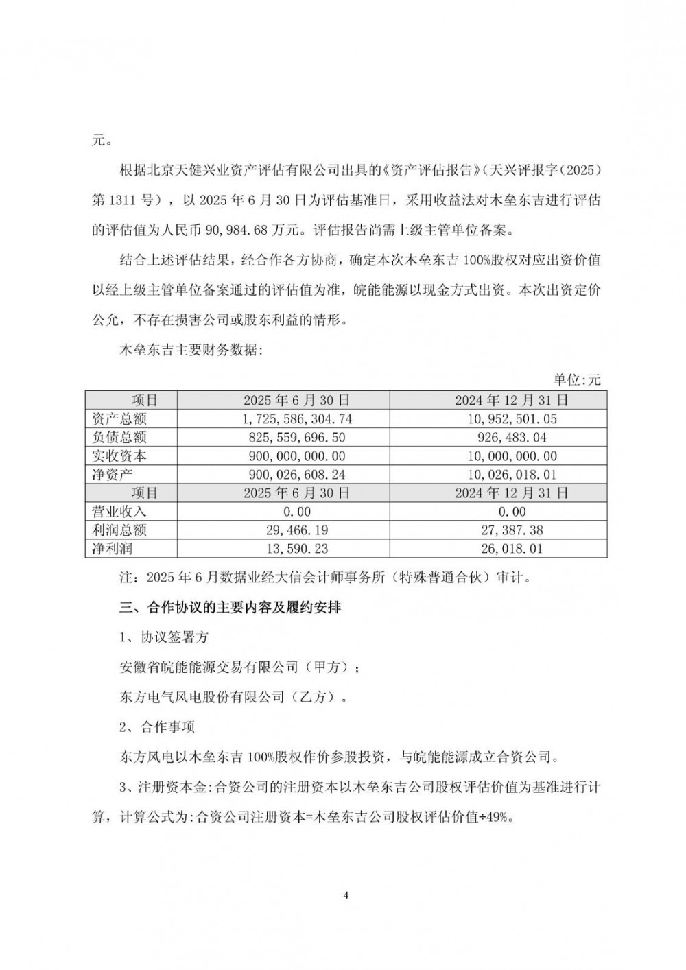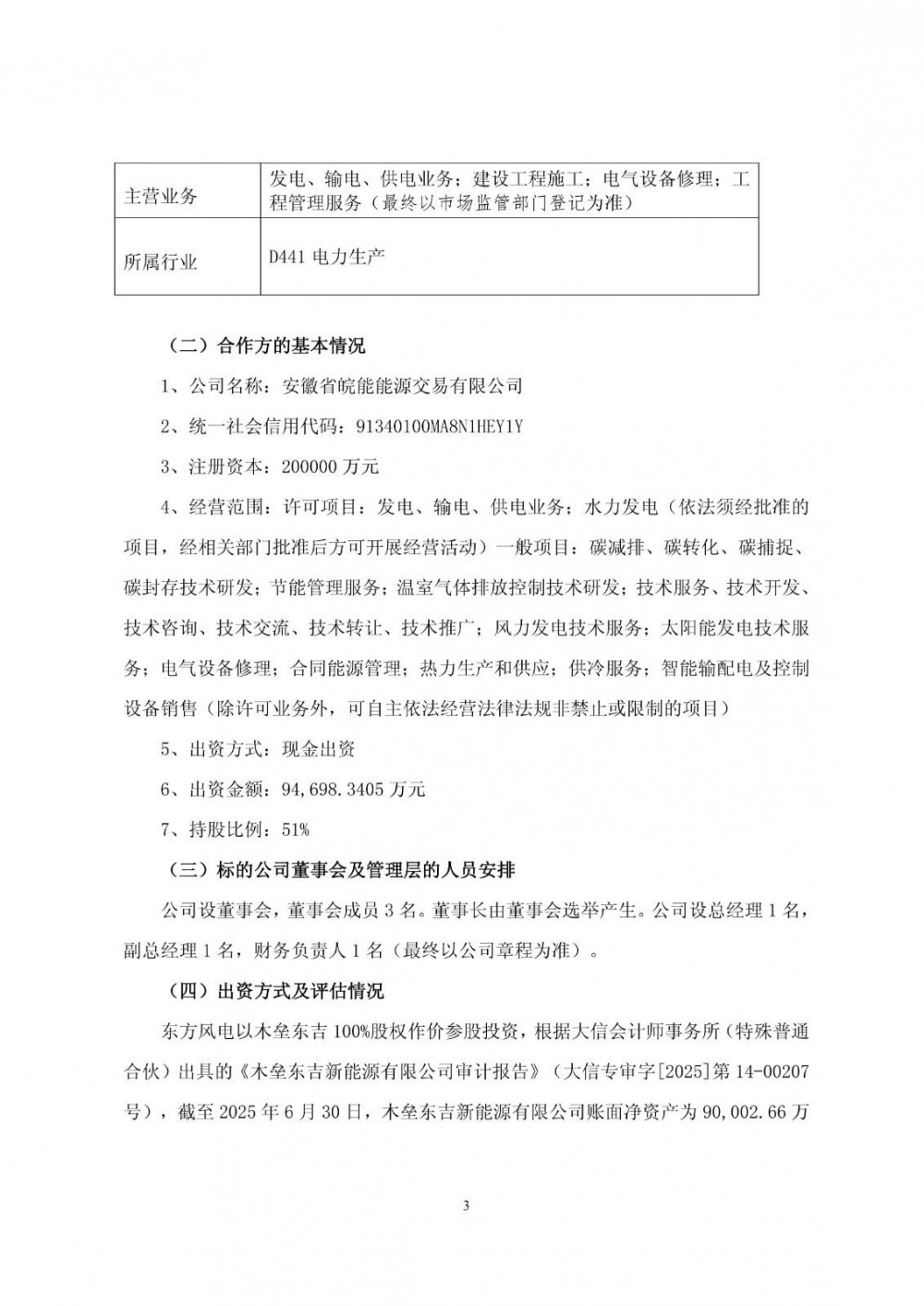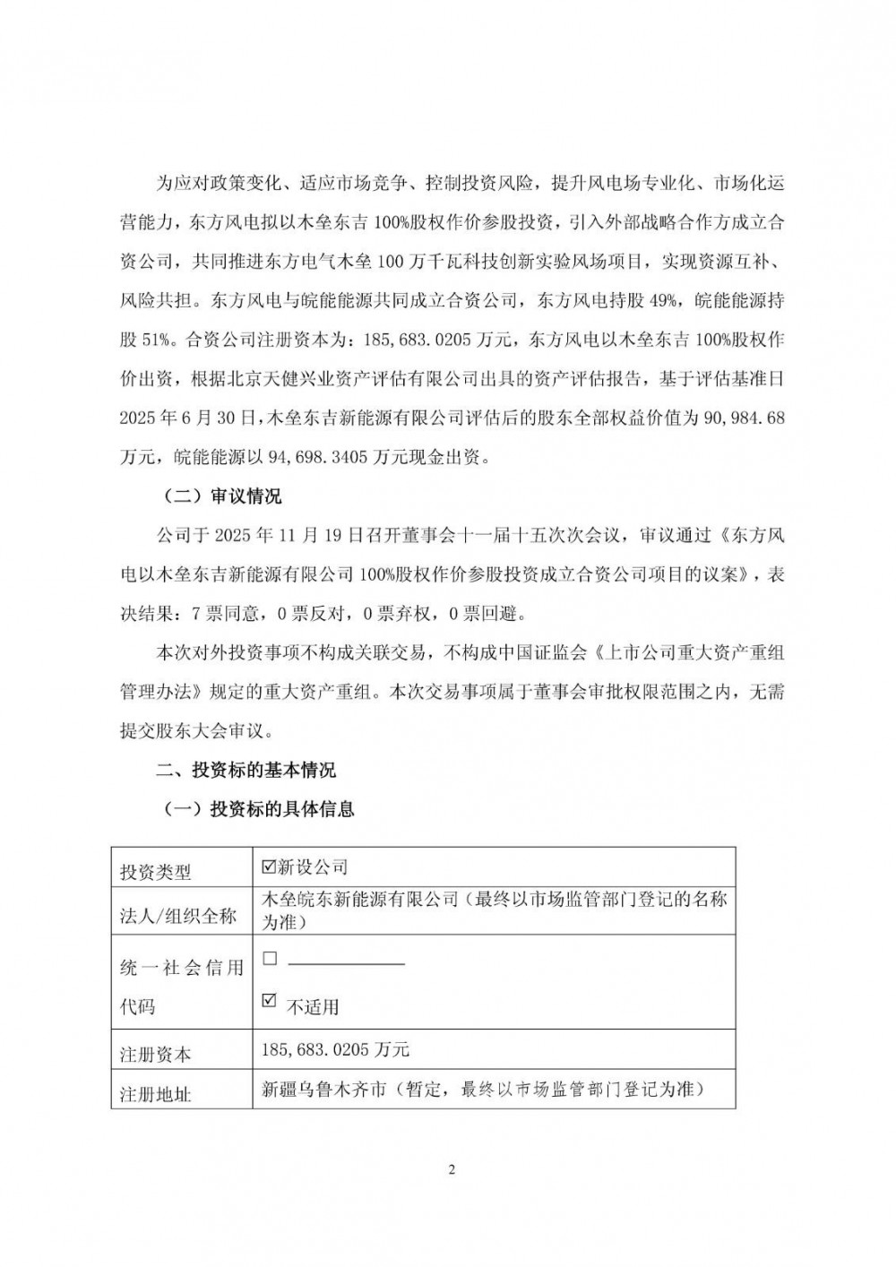 公告显示,为应对政策变化、适应市场竞争、控制投资风险,提升风电场专业化、市场化运营能力,东方风电拟以木垒东吉100%股权作价参股投资,引入外部战略合作方成立合资公司,共同推进东方电气木垒100万千瓦科技创新实验风场项目,实现资源互补、风险共担。东方风电与皖能能源共同成立合资公司,东方风电持股49%,皖能能源持股51%。