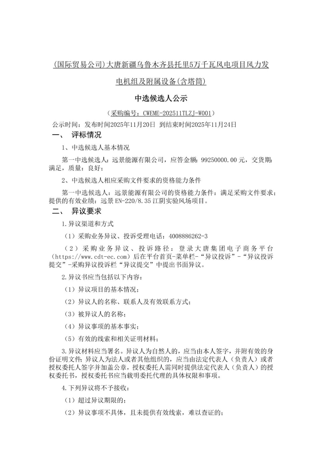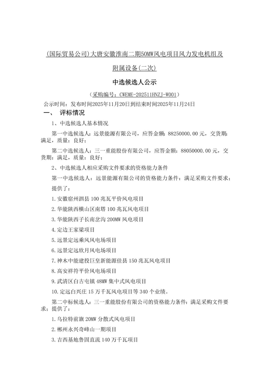 能源圈获悉,11月20日,大唐新疆乌鲁木齐县托里5万千瓦风电项目、大唐安徽淮南二期50MW风电项目、中广核新能源重庆酉阳大坪盖101MW陆上风电项目风力发电机组及附属设备中选候选人公示,规模合计201MW。