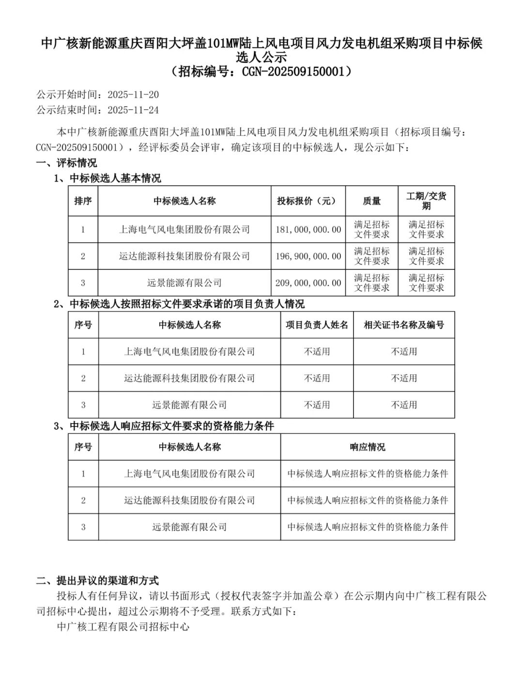 中广核新能源重庆酉阳大坪盖101MW陆上风电项目位于重庆市酉阳土家族苗族自治县南部李溪镇、南腰界镇余家坨一带山脊上。项目容量101MW,投标机型总容量不应超过101MW。项目机位数量18台;投标机型台数不应超过机位数量,单机容量5000kW及以上,可以混排。交货日期:预计在2026年6月至2026年11月完成交货最终交货期以招标人书面正式通知为准(招标人提前二个月通知投标人)。
