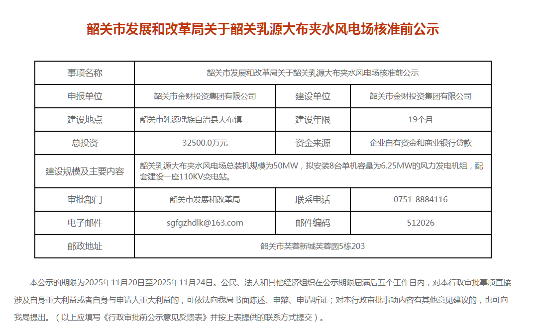 根据公示,韶关南雄前岭风电场一期项目建设单位由韶关市南雄粤风新能源有限公司变更为南雄市嘉源新能源有限公司,建设地点位于韶关市南雄市韶关南雄百顺镇、澜河镇一带山脊,总投资14500万元,建设年限11个月。项目建设规模15MW,安装3台单机容量为5.0MW的风力发电机组,按照容量不低于发电装机容量的10%、时长1小时配置新型储能,采用租赁方式落实储能配置。