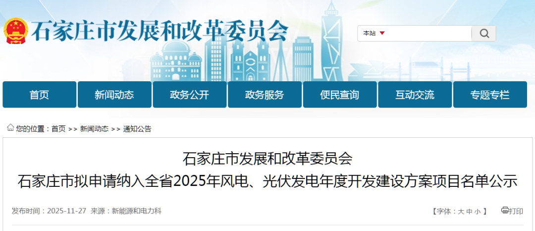 石家庄市发展和改革委员会石家庄市拟申请纳入全省2025年风电、光伏发电年度开发建设方案项目名单公示