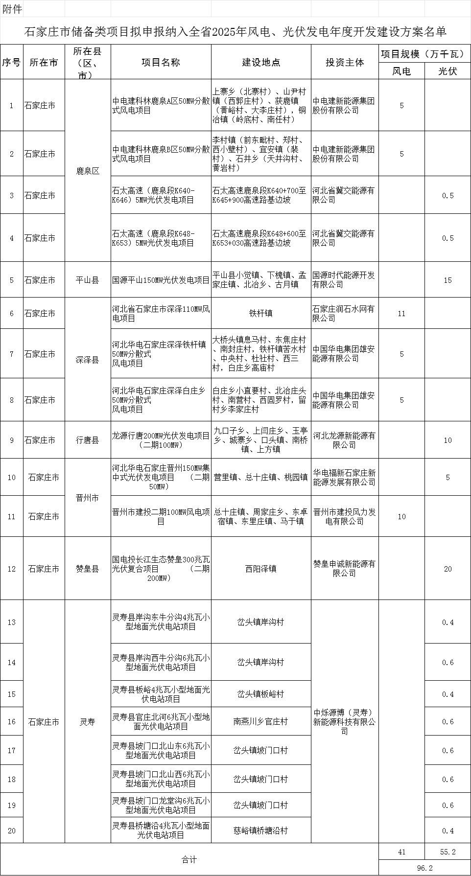公示显示,石家庄市储备类项目拟申请纳入全省2025年风电、光伏发电年度开发建设方案项目名单共20个,规模合计96.2万千瓦。