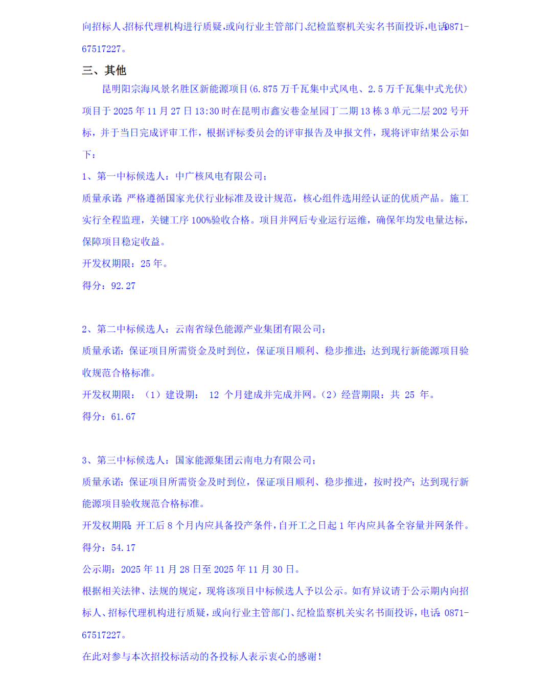 根据公示,中广核风电有限公司作为中标候选人第1名预中标。