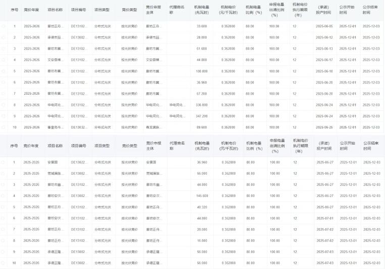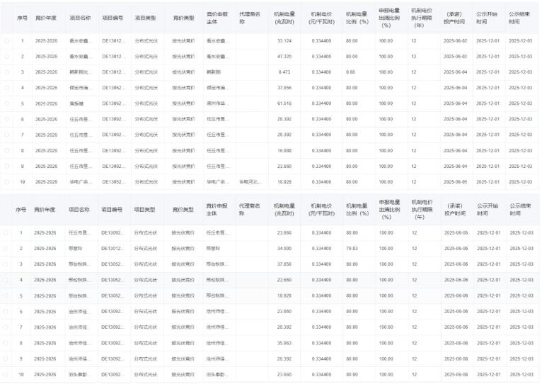 12月1日,国网新能源云公示2026年度河北增量新能源项目机制电价竞价结果。