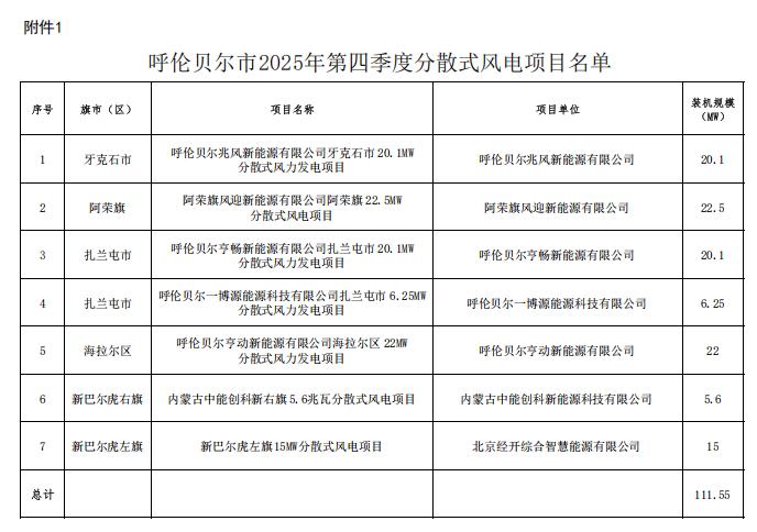 内容指出,呼伦贝尔市2025年度第四季度分散式风电项目共7个,规模合计111.55MW;呼伦贝尔市2025年度第四季度分布式光伏项目共2个,规模合计0.13MW。