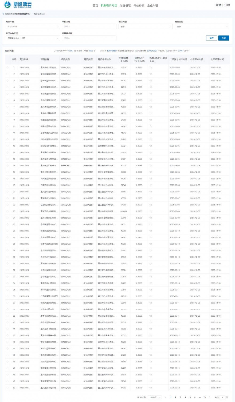 根据公示,2026年按光伏竞价项目竞价出清结果:机制电量规模1701982821千瓦时,机制电价水平0.3963元/千瓦时,项目3865个。