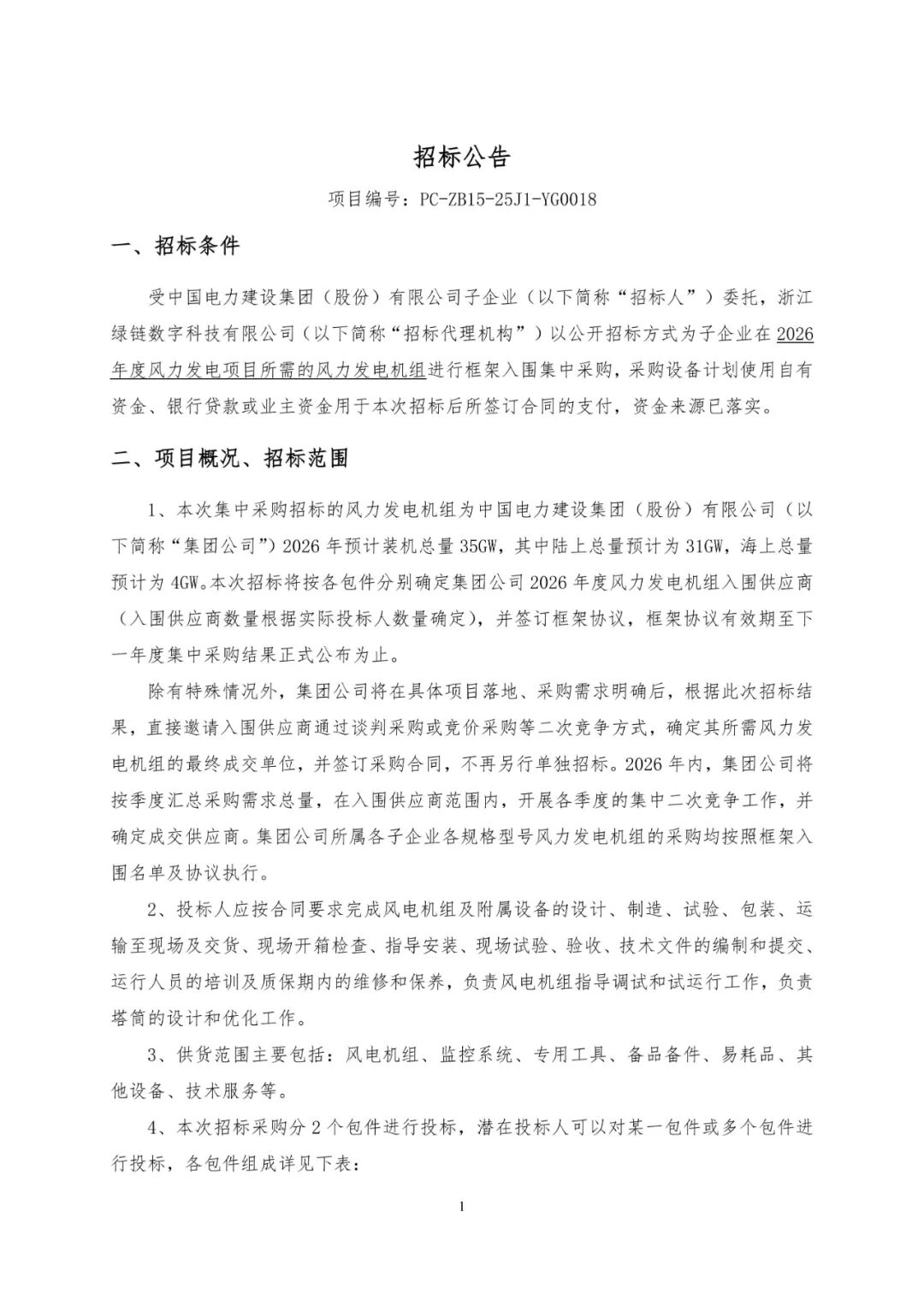 能源圈获悉,12月3日,中国电建2026年度风力发电机组框架入围集中采购项目公开招标公告发布。