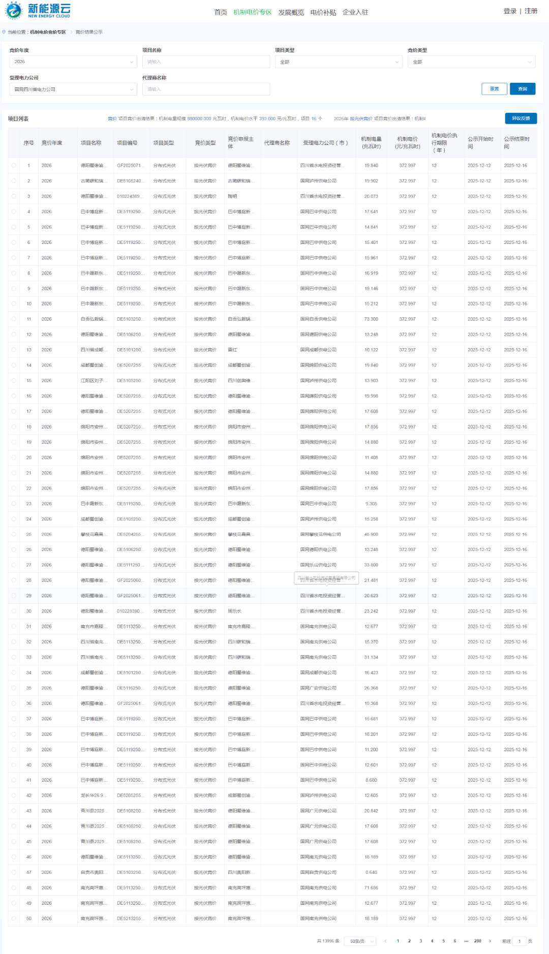 能源圈获悉,12月12日,国网新能源云公示四川省机制电价竞价结果。