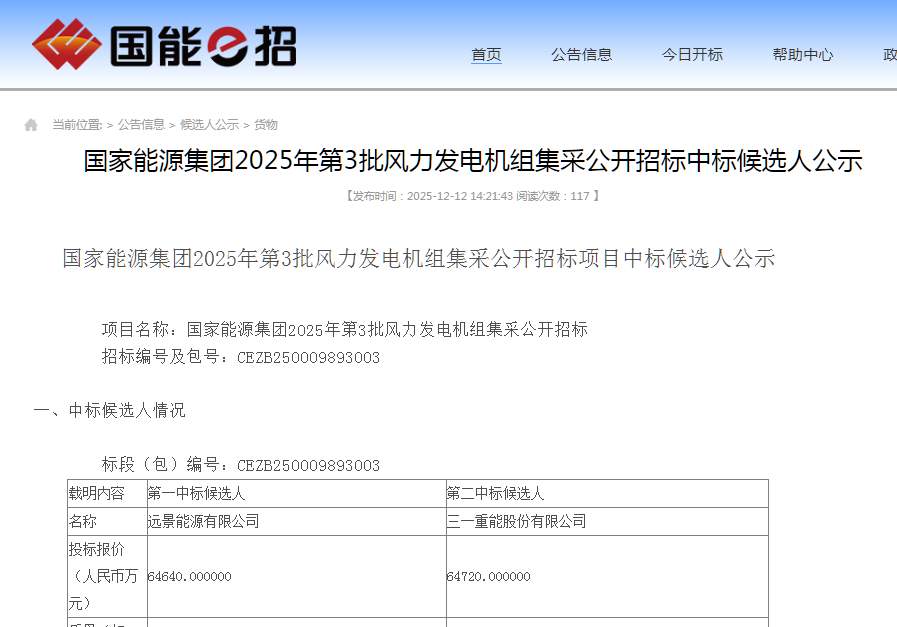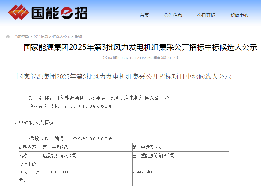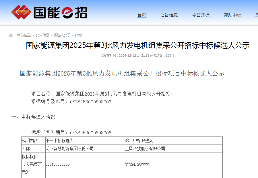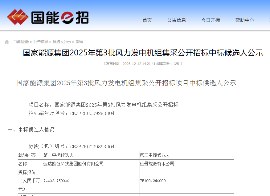 能源圈获悉,12月12日,国家能源集团2025年第3批风力发电机组集采公开招标中标候选人公示。