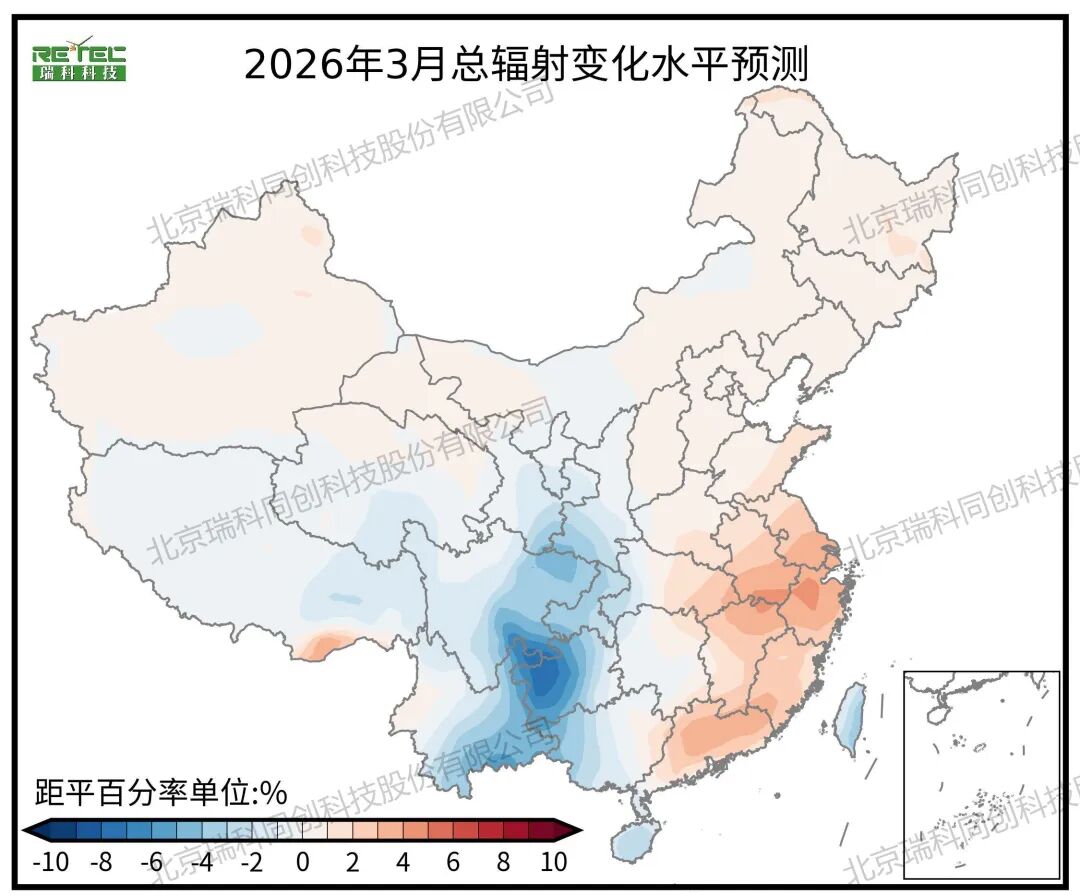 2026年2月,我国大部分地区总辐射较常年偏弱,尤其是西南地区(-5%~-10%),弱辐射中心位于贵州西北部,周边的四川东部、广西、湖南等地总辐射也较常年偏弱。该时段全国光伏整体出力承压,西南地区作为传统清洁能源输出基地的发电能力明显下降,限制了其在冬末春初关键时段对华中、华南负荷中心的支援作用,可能推高相关受端市场的购电成本;同时,全国范围内可用于跨省交易的光伏富余电量减少,或将促使市场主体更多依赖风电或火电调峰资源,对绿电交易规模和价格形成阶段性上行压力,凸显多能互补与跨区协同调度的重要性。