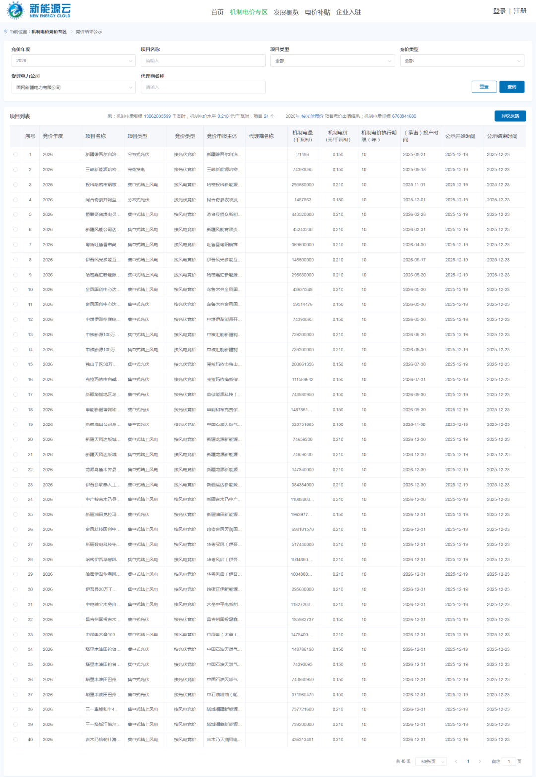 能源圈获悉,12月19日,国网新能源云公示新疆2026年风、光项目机制电价竞价结果。
