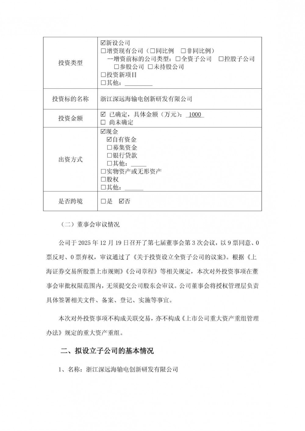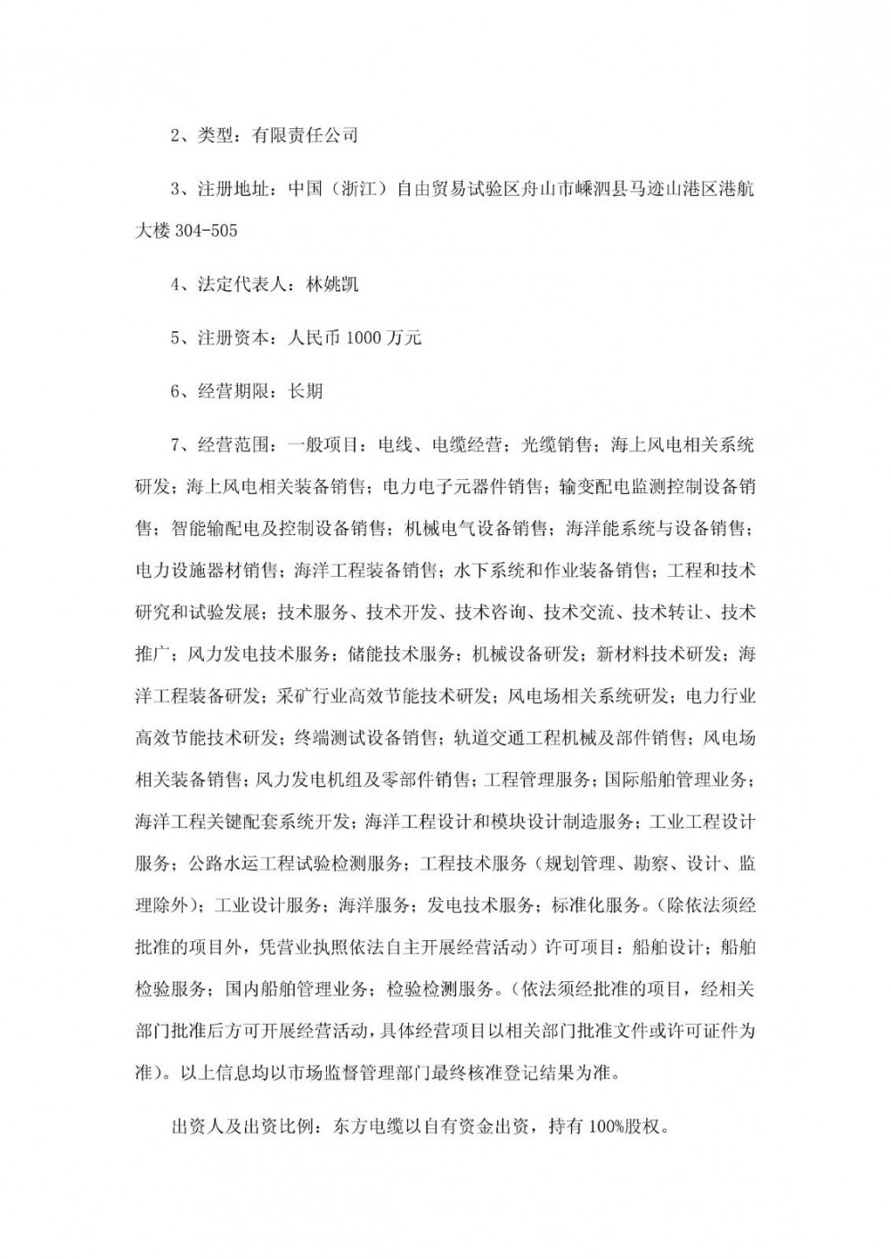 拟设立子公司名称为浙江深远海输电创新研发有限公司,注册资本为1000万元,经营范围包含:电线、电缆经营;光缆销售;海上风电相关系统研发;海上风电相关装备销售;海洋能系统与设备销售;海洋工程装备销售;风力发电技术服务;储能技术服务;风电场相关系统研发;风电场相关装备销售;风力发电机组及零部件销售;国际船舶管理业务;海洋工程关键配套系统开发;海洋工程设计和模块设计制造服务等。