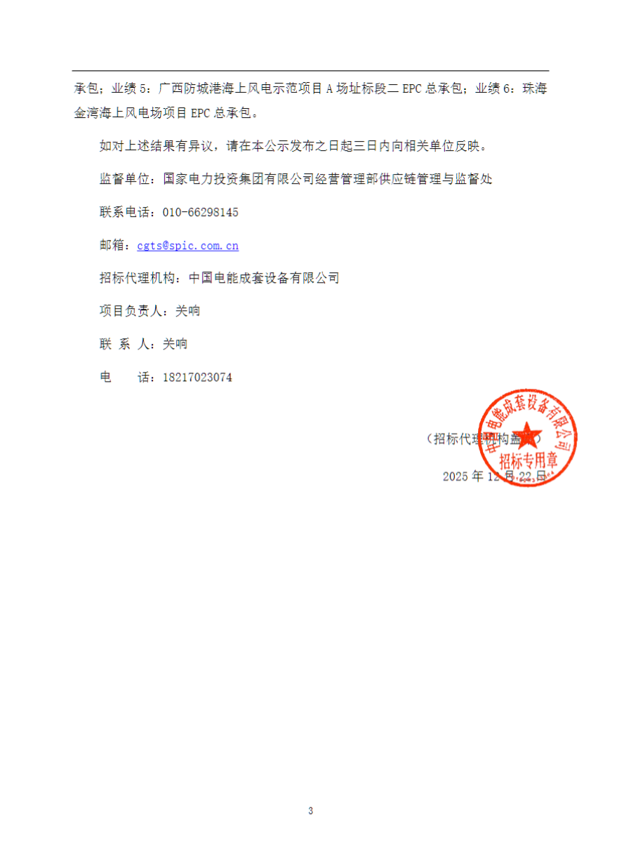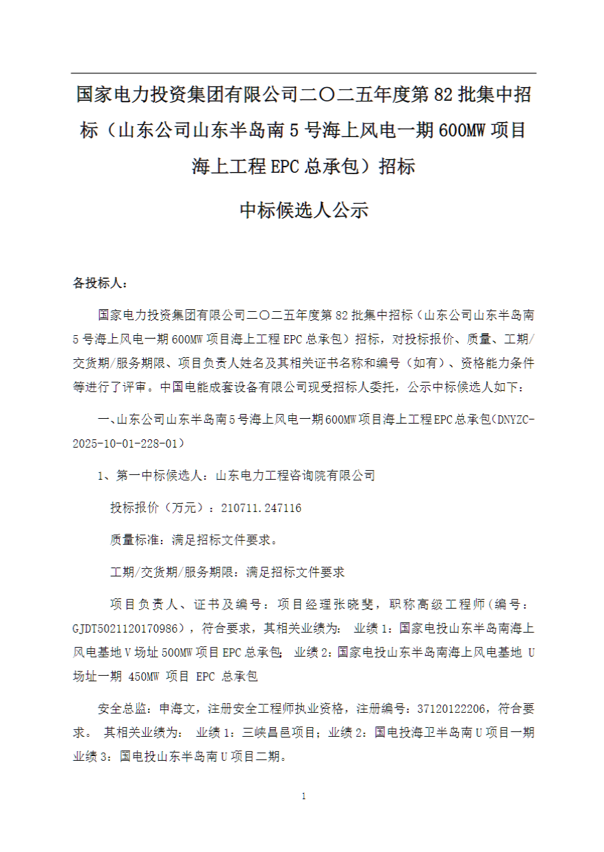 能源圈获悉,12月22日,国家电力投资集团有限公司二〇二五年度第82批集中招标(山东公司山东半岛南5号海上风电一期600MW项目海上工程EPC总承包)招标中标候选人公示。