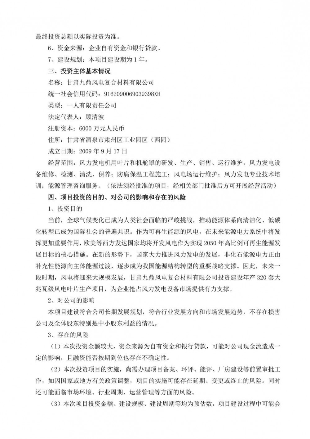 1月5日,江苏九鼎新材料股份有限公司发布关于全资子公司投资建设大型兆瓦级风电叶片生产线项目的公告。