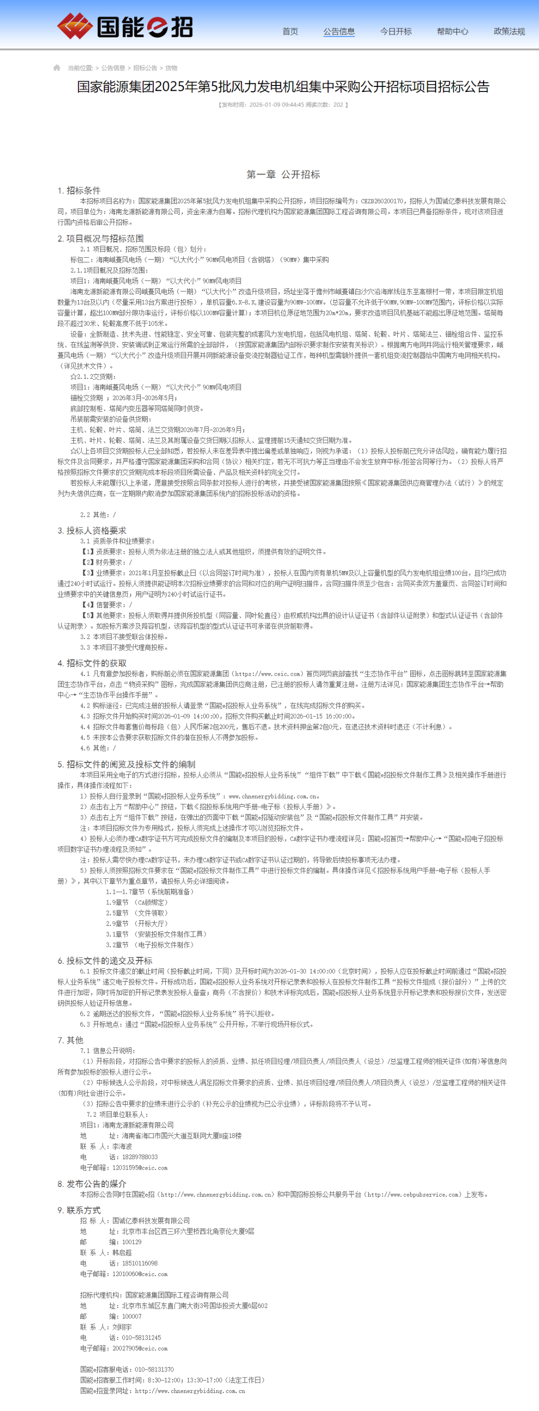 能源圈获悉,1月9日,国家能源集团2025年第5批风力发电机组集中采购公开招标项目招标公告发布。