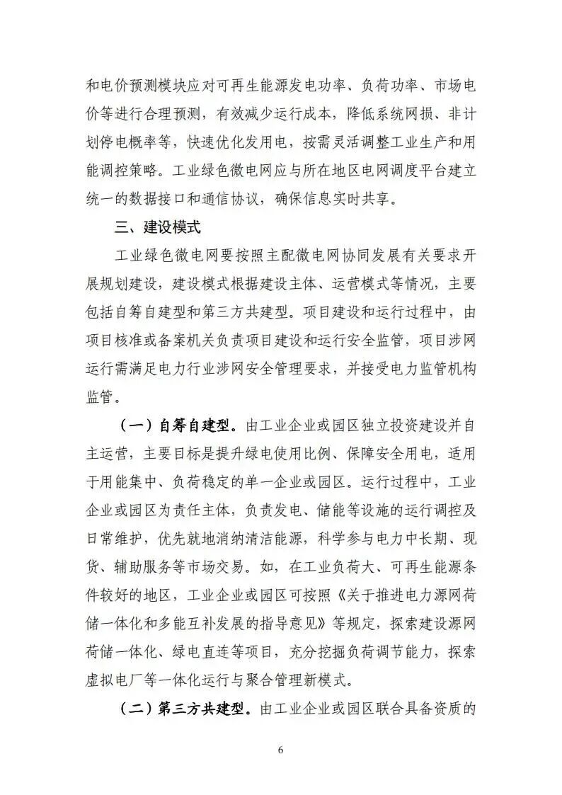 工业绿色微电网要按照主配微电网协同发展有关要求开展规划建设,建设模式根据建设主体、运营模式等情况,主要包括自筹自建型和第三方共建型。项目建设和运行过程中,由项目核准或备案机关负责项目建设和运行安全监管,项目涉网运行需满足电力行业涉网安全管理要求,并接受电力监管机构监管。