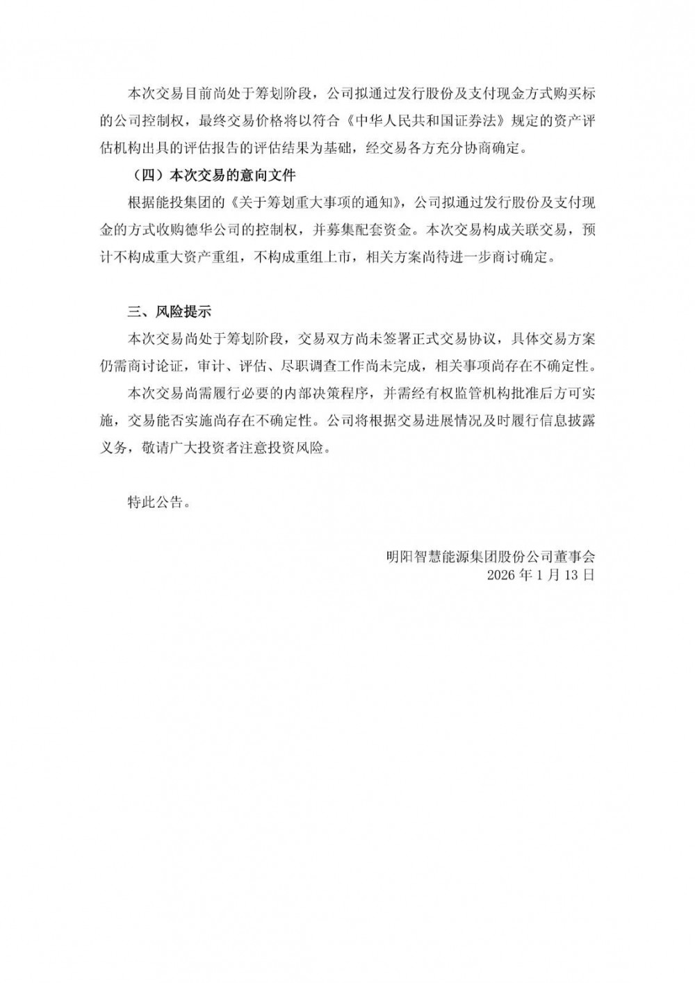 公告指出,明阳智能于2026年1月12日收到公司控股股东明阳新能源投资控股集团有限公司出具的《关于筹划重大事项的通知》,拟由公司通过发行股份及支付现金的方式收购中山德华芯片技术有限公司的控制权,并募集配套资金。本次交易尚处于筹划阶段。