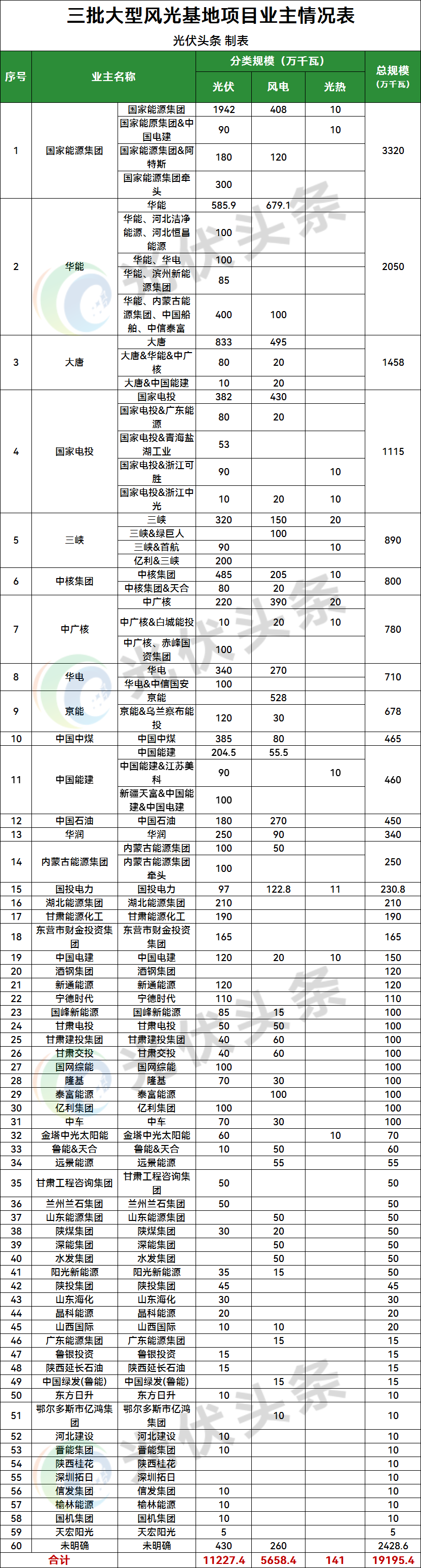 大基地项目因其规模庞大,送出线路有保障而备受央国企以及民营企业的重视。光伏头条梳理三批大基地业主情况,总计90个企业获得三批大基地项目指标,详情如下:
