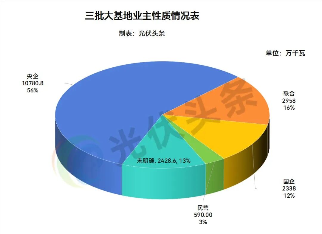 根据上述业主情况,央企合计获得10780.8万千瓦,占比56%;地方国企2338万千瓦,占比12%。多个企业组成的联合体合计获得2958万千瓦大基地项目,占比16%。民营企业获得590万千瓦大基地指标,占比3%。