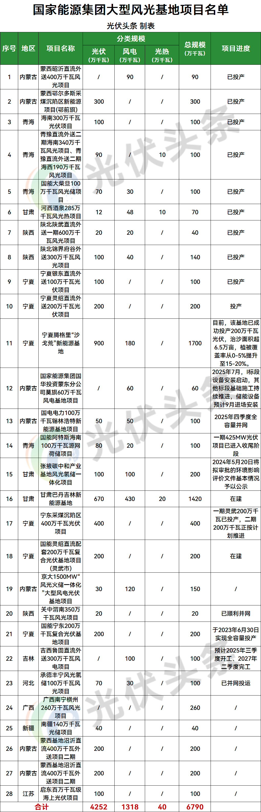 光伏头条根据公开信息梳理,国家能源集团拥有风光大基地项目28个,规模合计67.9GW,主要位于甘肃、广西、河北、吉林、江苏、内蒙古、宁夏、青海、陕西、新疆等地。其中,光伏42.52GW,风电13.18GW,光热400MW。