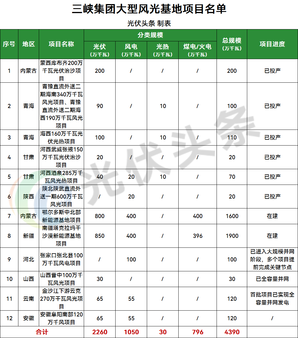 光伏头条统计,三峡集团风光大基地项目合计43.9GW,其中光伏项目22.6GW,风电项目10GW。这些项目分布于内蒙古、青海、甘肃、陕西、新疆、河北、山西、云南、安徽等省份。