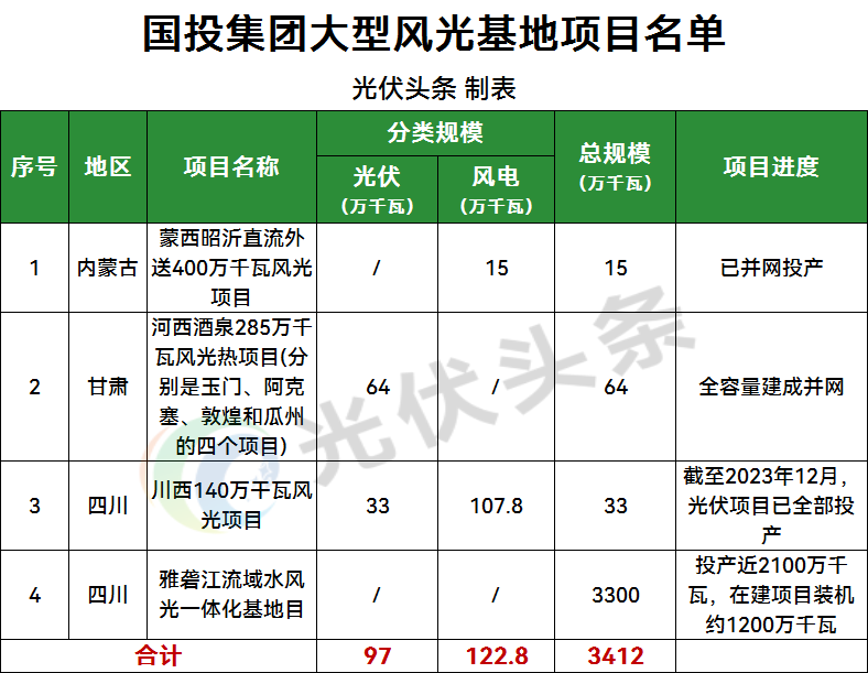 光伏头条统计,国投集团风光大基地项目主要位于四川、甘肃、内蒙古三地。其中,内蒙古蒙西昭沂直流外送400万千瓦风光项目、河西酒泉285万千瓦风光热项目(分别是玉门、阿克塞、敦煌和瓜州的四个项目)已建成投产。川西140万千瓦风光项目之中330MW光伏项目已建成投产。