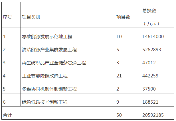 试点建设重点工程项目共50个,总投资为2059亿元。其中,零碳能源发展示范地工程类项目10个,投资额为1461.4亿元;清洁能源产业集群发展工程类项目5个,投资额为526.3亿元;再生纺织品产业全链条贯通工程类项目3个,投资额4.7亿元;工业节能降碳改造工程类项目21个,投资额44.2亿元;多维协同机制体制创新工程类项目2个,投资额为3.8亿元;绿色低碳技术创新工程项目类9个,投资额为18.9亿元。