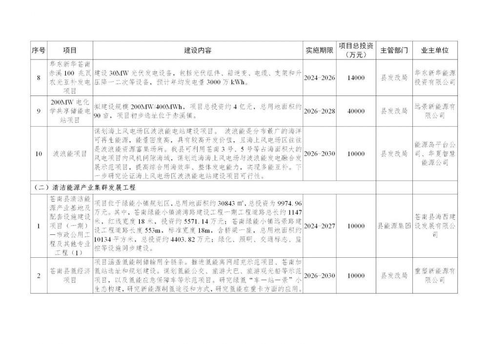 推进风电倍增发展。积极稳妥推进苍南海上风电项目规模化发展,加快推进苍南1号海上风电二期项目、2号海上风电二期项目、3号海上风电项目、5号海上风电项目、6号海上风电项目及苍南风电示范项目,争取推进Z5深远海风电项目,推进漂浮式风电试点示范,力争到2030年,苍南县海上风电装机突破560万千瓦,实现海上风电跨越式发展。探索海上风电基地发展新模式,创新“海洋能+储能+制氢+海洋牧场+陆上产业基地”的一体化协同开发方式。稳步开展老旧风电场改造升级,推进苍南霞关风电场改造升级及新增智能调控系统项目与苍南皇帝平31MW风电场改造升级项目。