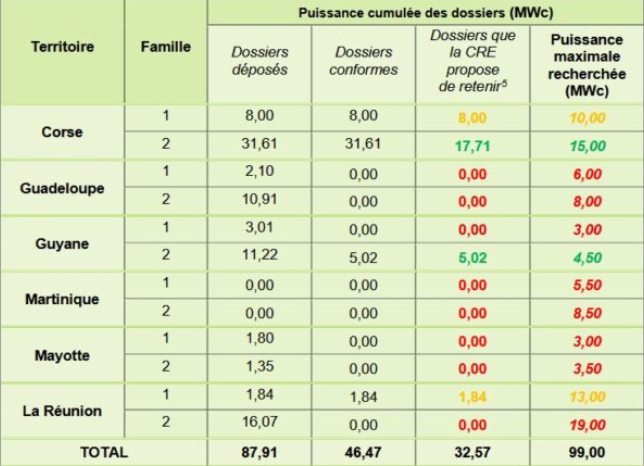 五个中标项目分别位于法国的海外领土及科西嘉岛。其中,阿库奥能源公司位于科西嘉岛阿莱里亚的弗拉索内项目获得了17.7兆瓦的容量,为最大中标项目。其他中标者包括索莱尔通用公司、沃尔塔利亚公司及阿尔比奥马印度洋太阳能公司等,项目地点分布于科西嘉岛、法属圭亚那和留尼汪岛。