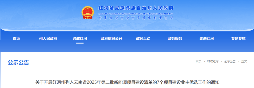 能源圈获悉,1月12日,红河哈尼族彝族自治州人民政府发布关于开展《红河州列入云南省2025年第二批新能源项目建设清单的7个项目建设业主优选工作》的通知。