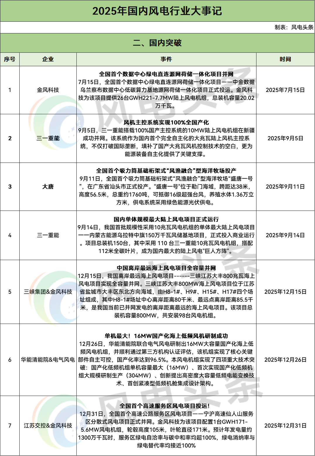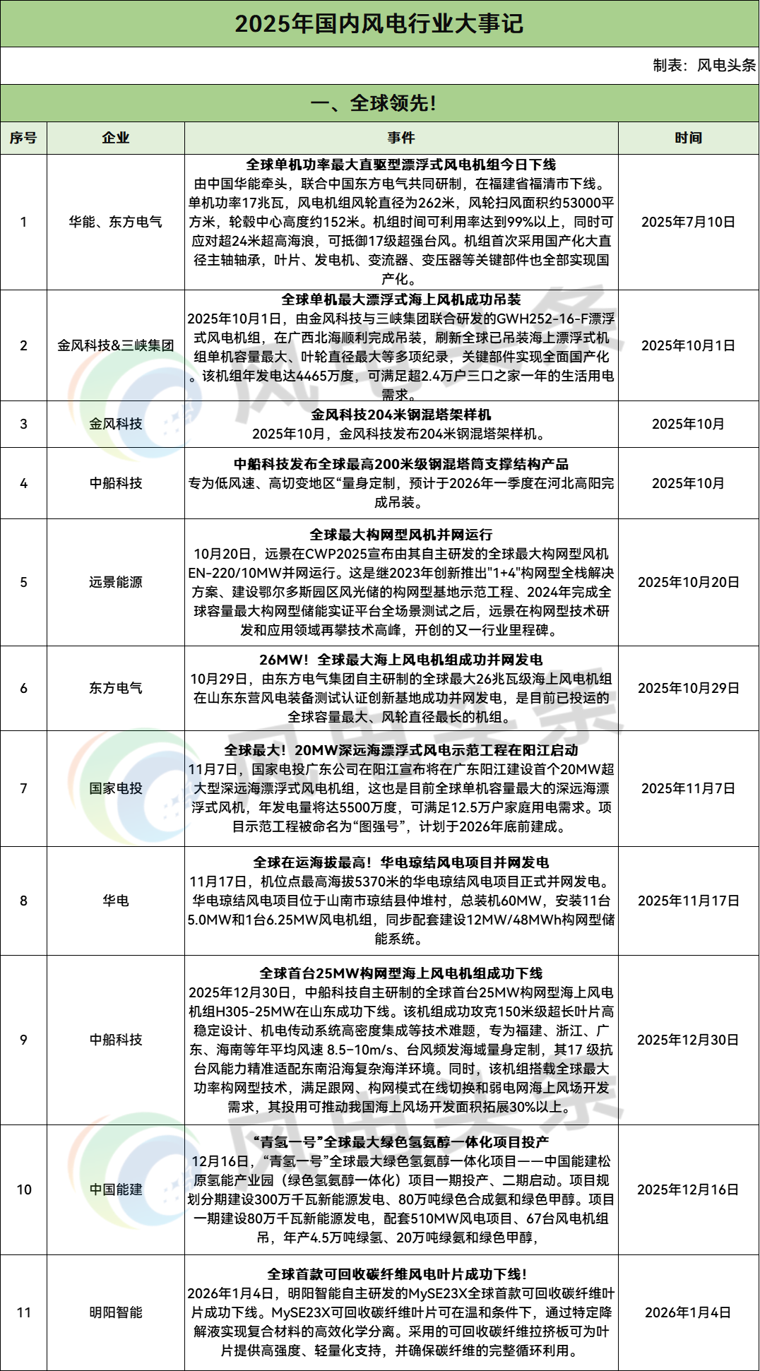 7、全球首台构网型海上风机下线:2025年12月30日,中船科技研制的全球首台25兆瓦构网型海上风电机组在山东成功下线,具备17级抗台风能力。