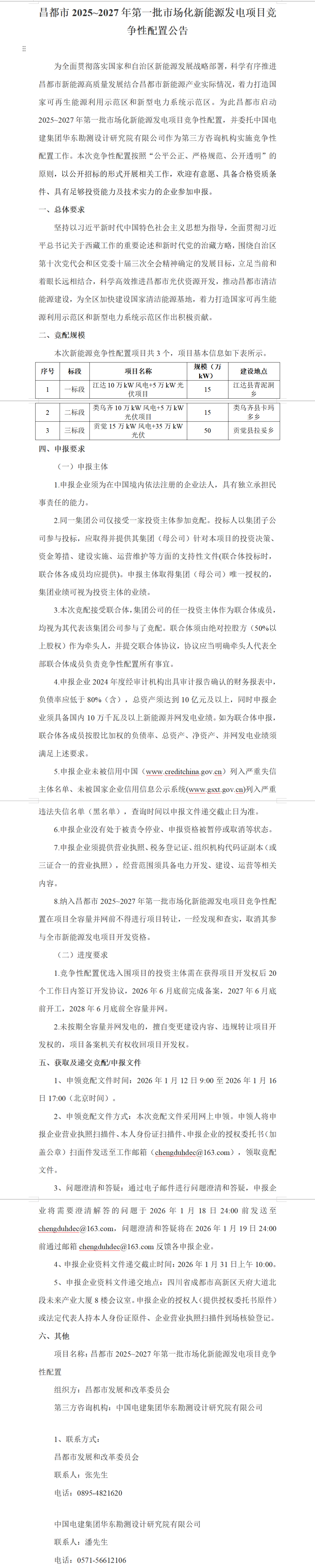 文件指出,本次竞配由中国电建集团华东勘测设计研究院有限公司作为第三方咨询机构实施竞争性配置工作。