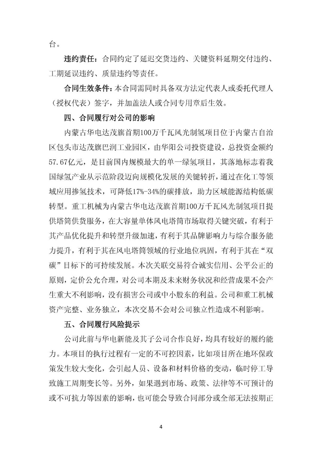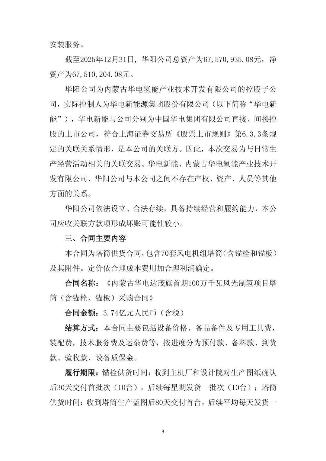 公告显示,近日,华电科工股份有限公司全资子公司华电重工机械有限公司(简称“重工机械”)与内蒙古华电华阳氢能科技有限公司(简称“华阳公司”)签署了《内蒙古华电达茂旗首期100万千瓦风光制氢项目塔筒(含锚栓、锚板)采购合同》,合同金额约为3.74亿元人民币(含税)。