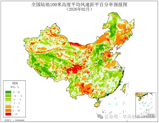图1.2 2026年2月全国陆地100米高度平均风速距平百分率预报图