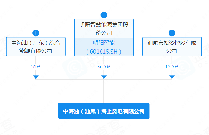据企查查股权穿透图显示,该公司由中国海油旗下中海油(广东)综合能源有限公司(51%)、明阳智能(36.5%)、汕尾市投资控股有限公司(12.5%)共同持股。