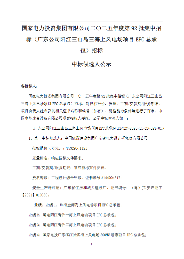 能源圈获悉,1月22日,国家电力投资集团有限公司二〇二五年度第92批集中招标(广东公司阳江三山岛三海上风电场项目EPC总承包)招标中标候选人公示。