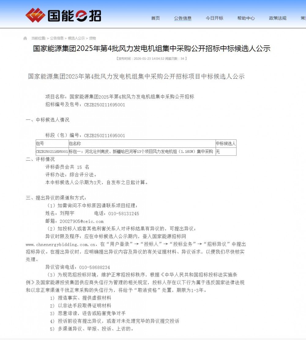 能源圈获悉,1月23日,国家能源集团2025年第4批风力发电机组集中采购-标包一中标候选人公示。