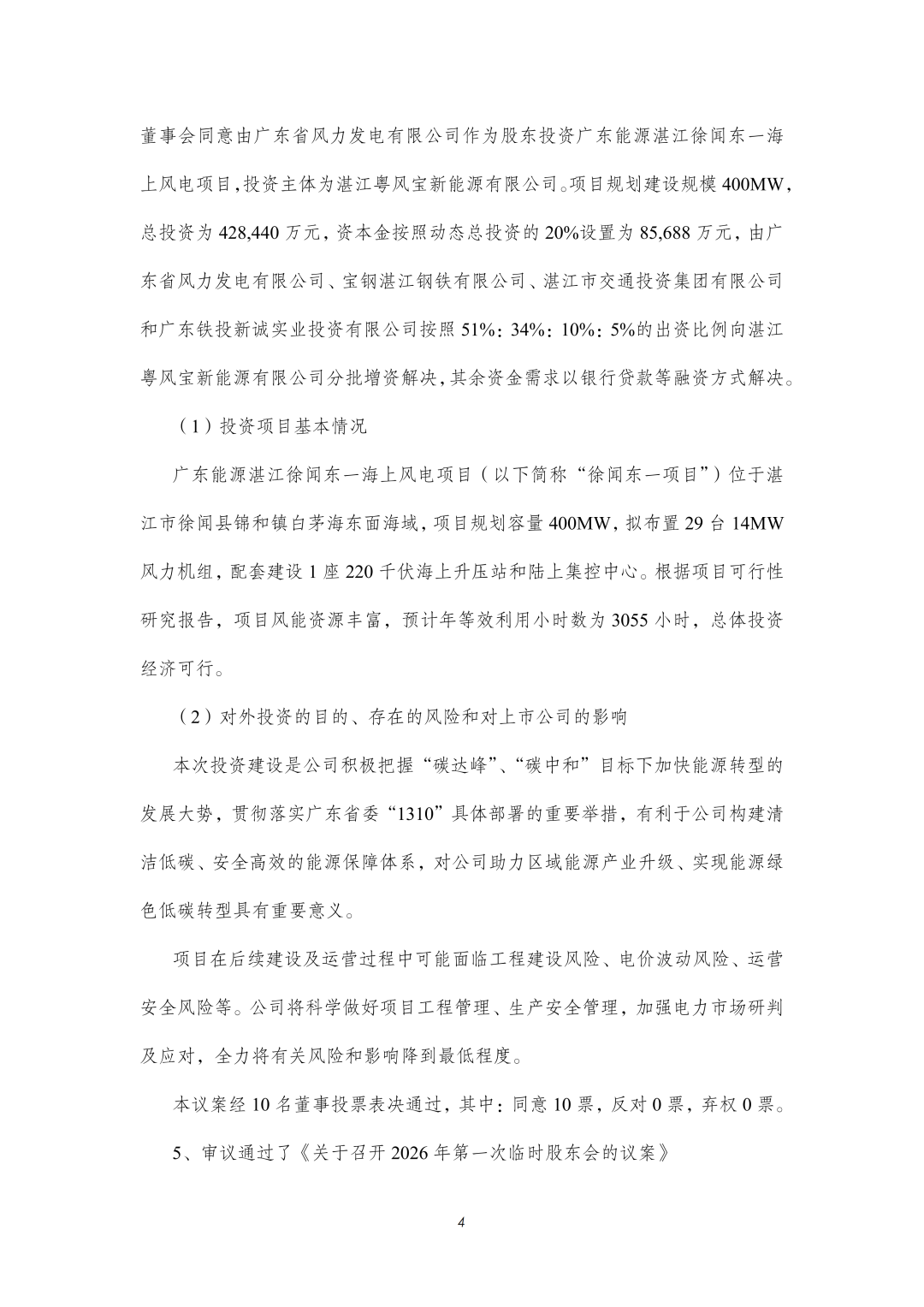 公告中披露,董事会同意由广东省风力发电有限公司作为股东投资广东能源湛江徐闻东一海上风电项目,投资主体为湛江粤风宝新能源有限公司,总投资42.84亿元。