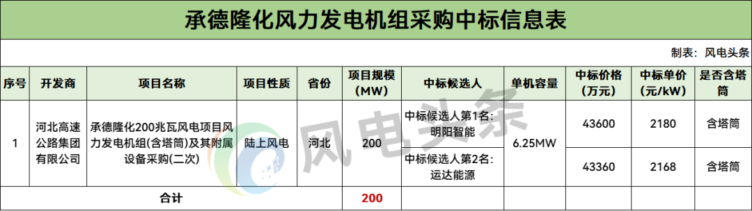 1月29日,河北省承德隆化200兆瓦风电项目风力发电机组(含塔筒)及其附属设备采购(二次)中标候选人公示。