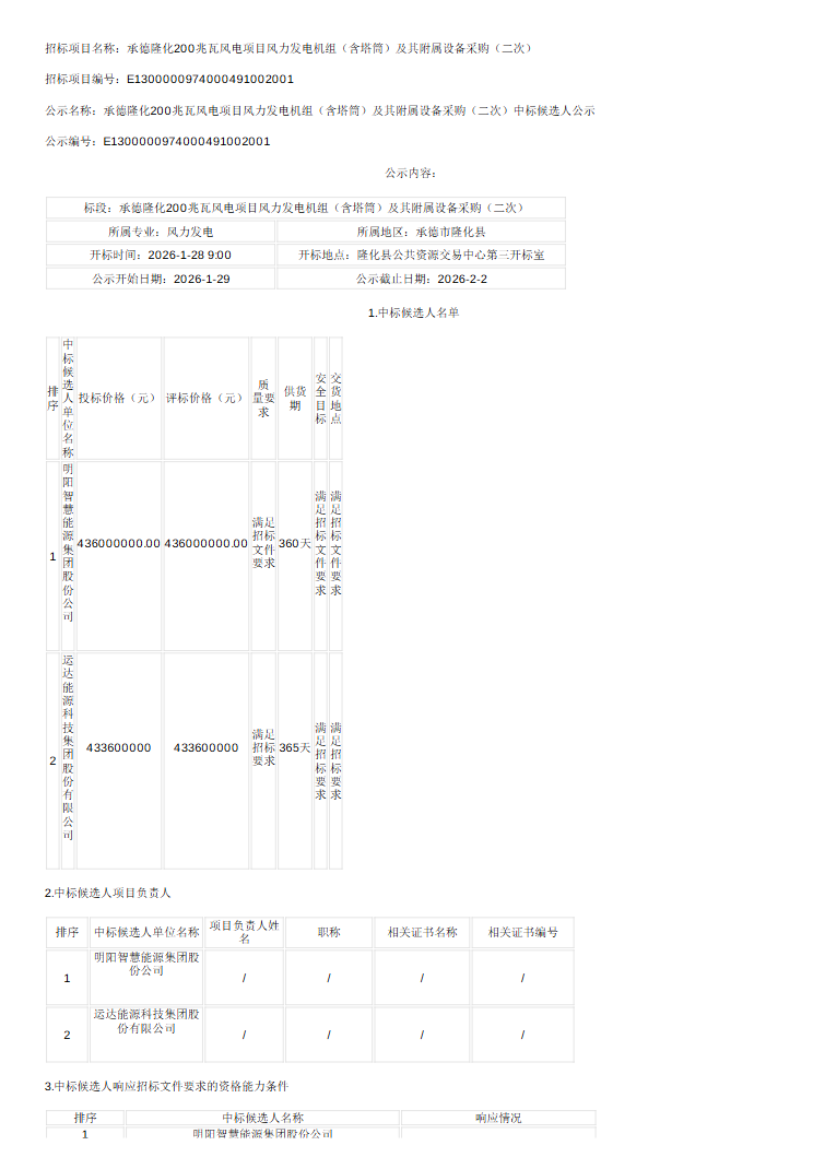 承德隆化200兆瓦风电项目风力发电机组(含塔筒)及其附属设备采购(二次)中标候选人公示第1次公示