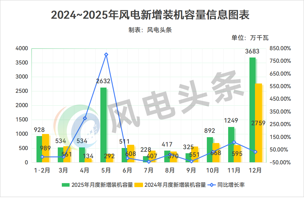 进入下半年,装机量开始爆发式增长,尤其在第四季度形成冲刺高峰:10月至12月合计新增装机5818万千瓦,占全年总量的48.7%。其中12月单月新增3683万千瓦,同比增长33.49%,单月增量即占全年31%,创下阶段性峰值。