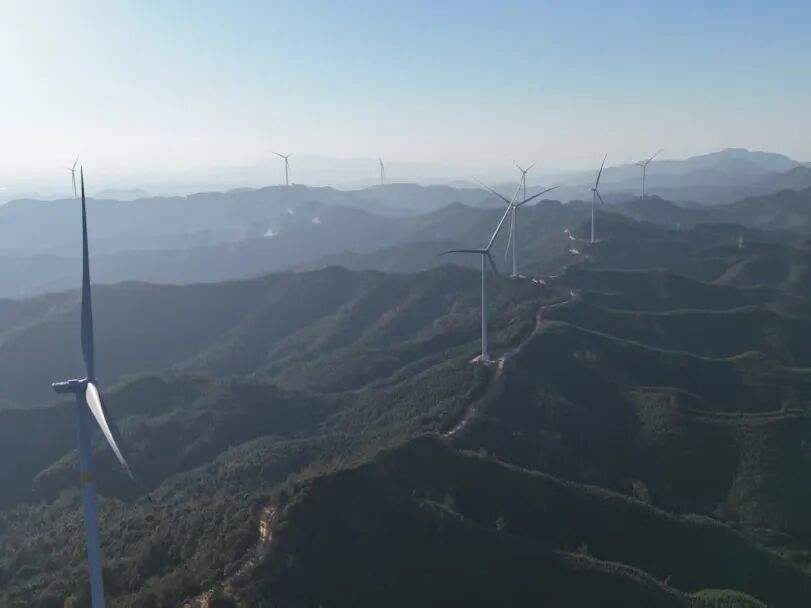 该项目坐落于湘西南与广西交界的崇山峻岭间,位于湖南怀化通道侗族自治县。项目南区总装机46.25MW,项目直面75度陡坡、垂直崖壁等极限地形,以无人机航测精准勘测,用高精度控制爆破开辟作业平台,搭配多重防护网筑牢安全防线。选用2400t汽车起重机解决狭窄场地吊装难题,采用“骡马队+无人机”联运模式打通物资运输通道,施工人员以 “攀岩式”作业完成悬崖风机吊装、铁塔组立等艰巨施工任务,尽显“电建铁军”实力。项目每年可输送1.53亿千瓦时清洁电力,为山区新能源开发积累宝贵经验。雪后初霁,银白色风机在山脊转动,将山风化为暖流,用绿色电能守护万家团圆,生动诠释“绿水青山就是金山银山”的发展理念。